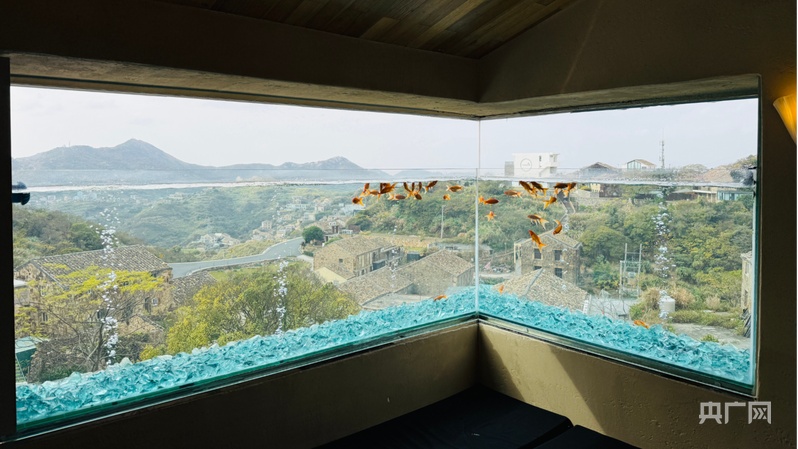 海利村一咖啡馆内,透过清澈的鱼缸望向渔村别有一番风味(央广网记者 李晓晓 摄)